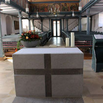 2012 - 2015 Grundlegende Erneuerung und Renovierung erfuhr die Kirche auch im Inneren. Der Altarraum wurde neu gestaltet und den Erfordernissen angepasst. Wichtig war Pfarrer Walter Huber und dem Kirchenvorstand, dass der ursprüngliche Charakter der Kirche erhalten blieb, der Raum jedoch zeitgemäßer genutzt werden kann. Der neue Altar, der in der Lichtachse der beiden Seitenfenster steht und aus heimischem Muschelkalk gebaut ist, soll in seiner schlichten, aber massiven Form zeigen, wozu er dient: Der Sammlung der Gemeinde, zum Mahl der Versöhnung und der Gemeinschaft.